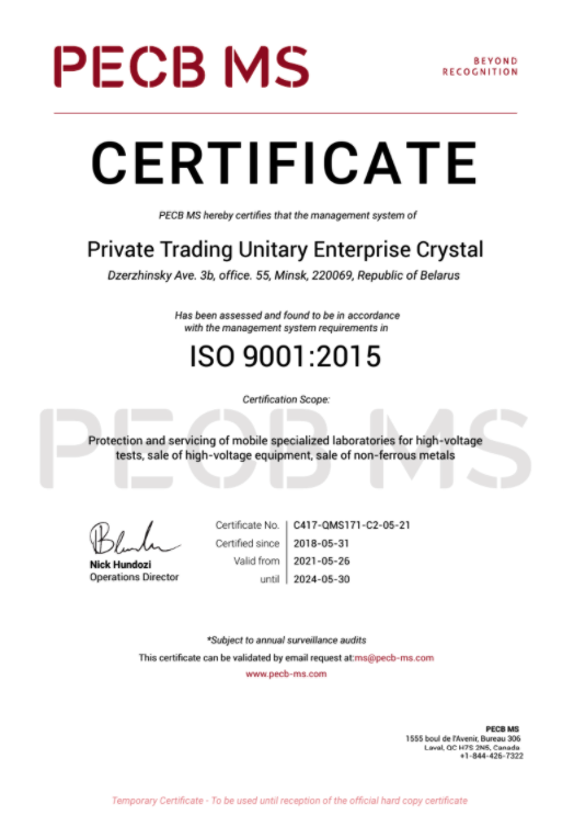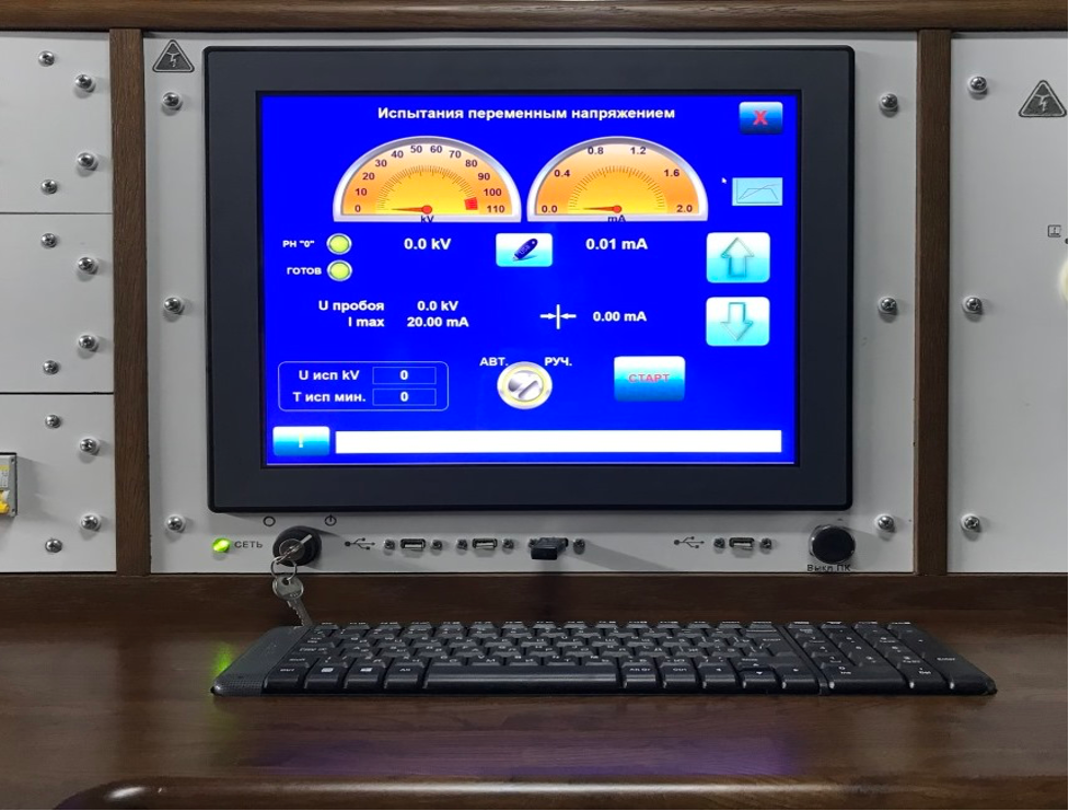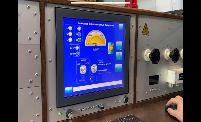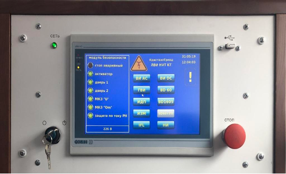 Система управления лабораторией имеет сенсорный графический экран, с интуитивно понятным интерфейсом, наглядно показывающий с помощью текстовых подсказок и индикаторов состояние измерительной системы, выбранный режим работы, состояние всех блокировок и защит, текущие значение напряжения и времени выдержки.