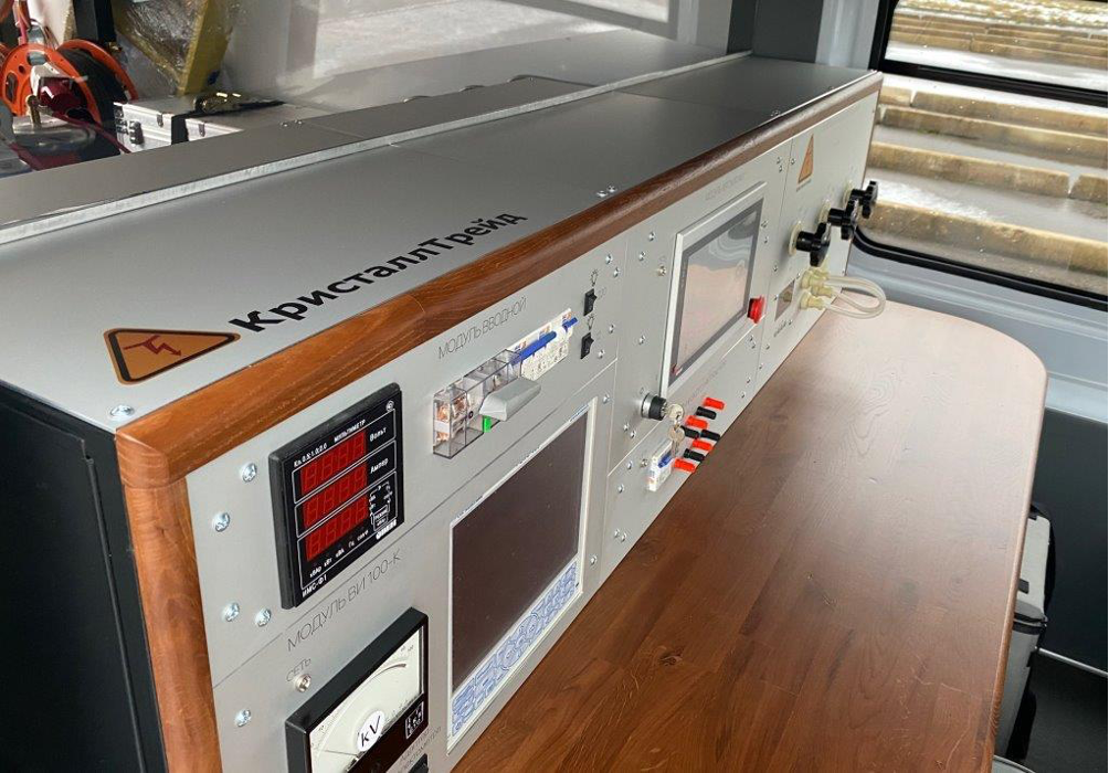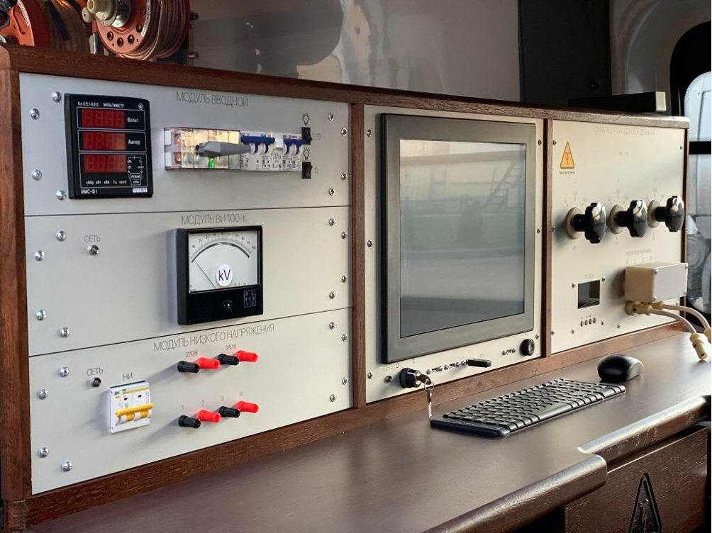 В состав сетевого пульта входит вводной блок (организация питания пульта управления и силового оборудования ЛВИ с видимым разрывом питающей сети, защита питания цепей управления), пульт сетевой (обеспечивает микроконтроллерное управление), блок управления высоковольтными испытаниями, блок низковольтных измерения, блок контроля заземления.