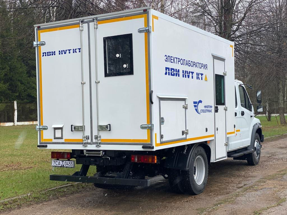 Кузов: состоит из отсеков оператора и высоковольтного. Кузов выполнен теплоизолированным из пластиковых сэндвич-панелей. Определены места для штатного расположения, касок, аптечки, огнетушителя. Штатно размещены все рабочие приборы и приспособления. В отсеке оператора установлен пульт управления, стол, кресло оператора. Для предотвращения прикасания к токоведущим частям специальная перегородка отделяет отсек оператора от высоковольтного отсека. Установлены выдвижные инструментальные пеналы для хранения комплектации и ЗИП-1шт. Посадочные места: в кабине – 6+1 шт. Для вывода кабелей с последующим подключением их к объекту, в задней части предусмотрен кабельный лючок. Для комфортной работы в отсеке оператора предусмотрены два окна и одно окно в высоковольтном отсеке. Одно окно с запираемой форточкой в отсеке оператора. Компоновка дверей: задние двери распашные, боковая дверь. Двери автофургона запираются на ключ. Боковая дверь имеет запорное устройство, позволяющее открывать ее изнутри пассажиром, а также фиксаторы открытого положения. Все двери фургона оборудованы лестницей для безопасного подъема и спуска обслуживающего персонала. Окраска фургона, автомобиля, логотипы и надписи будут выполнены в соответствии с действующими в организации Заказчика требованиями к корпоративному стилю. Имеется выгородка изотермическая, с дверью с наружи под генератор автономного питания ЛВИ и отводом выхлопных газов. В высоковольтном отсеке у распашной двери предусмотрена площадка (площадью 1м2) для удобной загрузки/выгрузки и транспортировки вспомогательного испытательного оборудования.